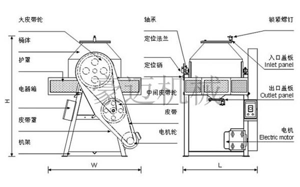 1.混合料筒为W型的双锥形圆筒,材料为304-2B优质不锈钢板圈圆密焊成型,更利于物料混合完毕后对筒体的清洗.整机经精密打磨、抛光处理,具有表面光滑、无死角、出料彻底、易清洗等特点;